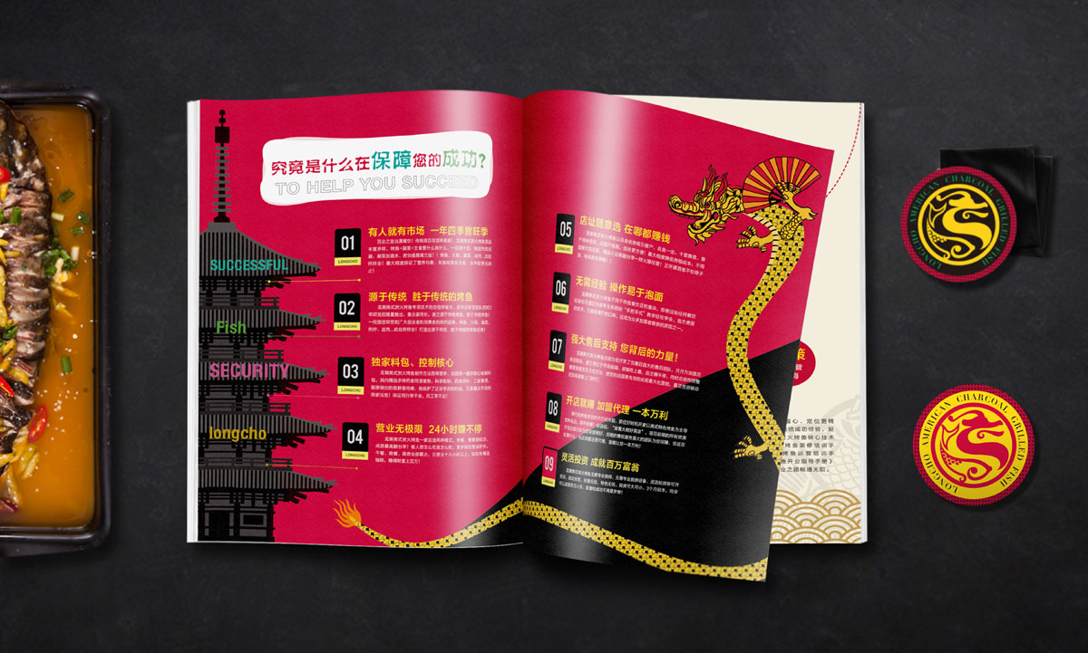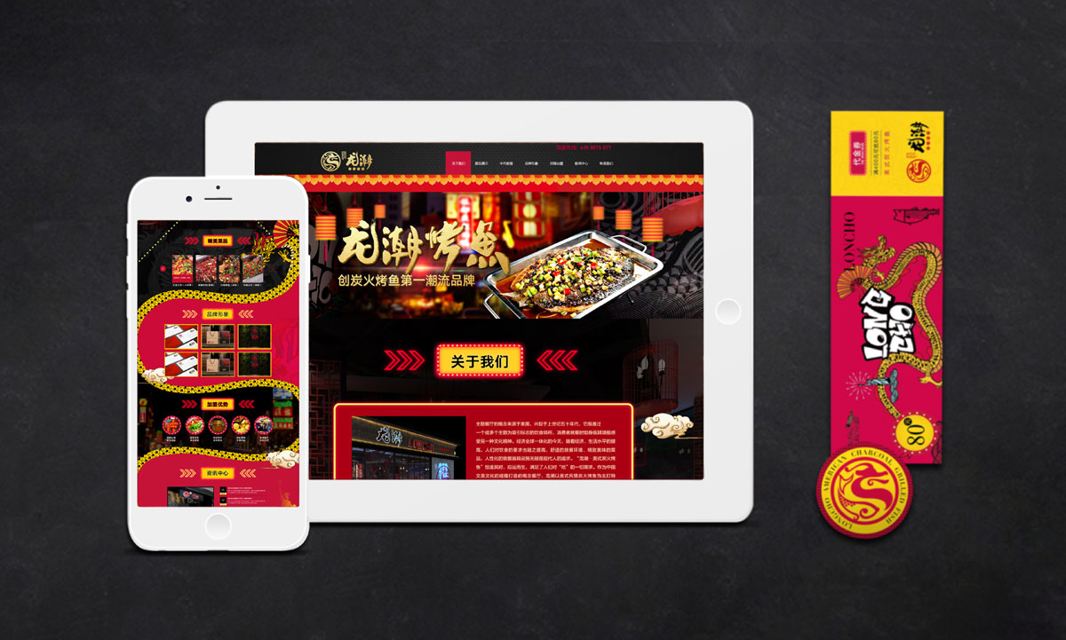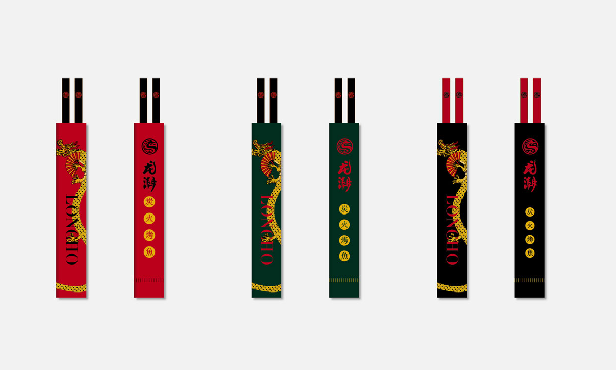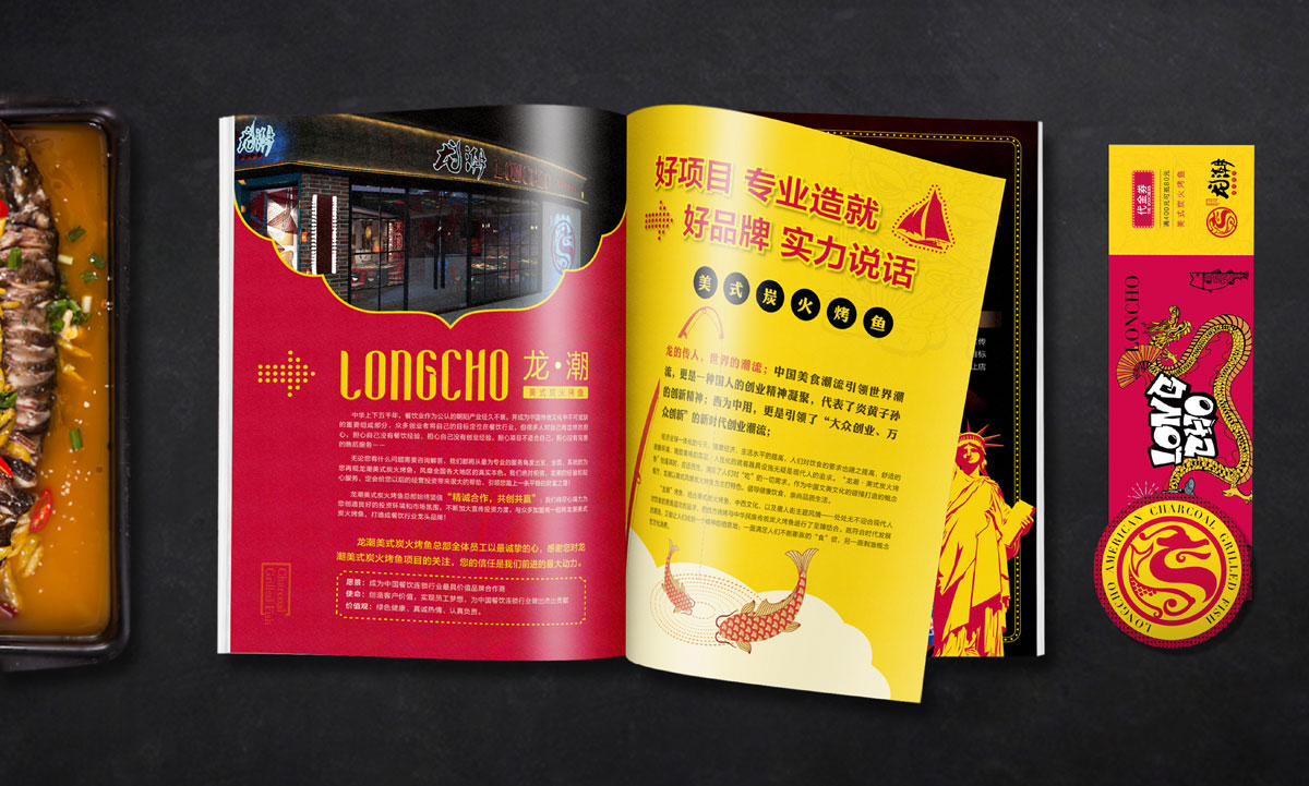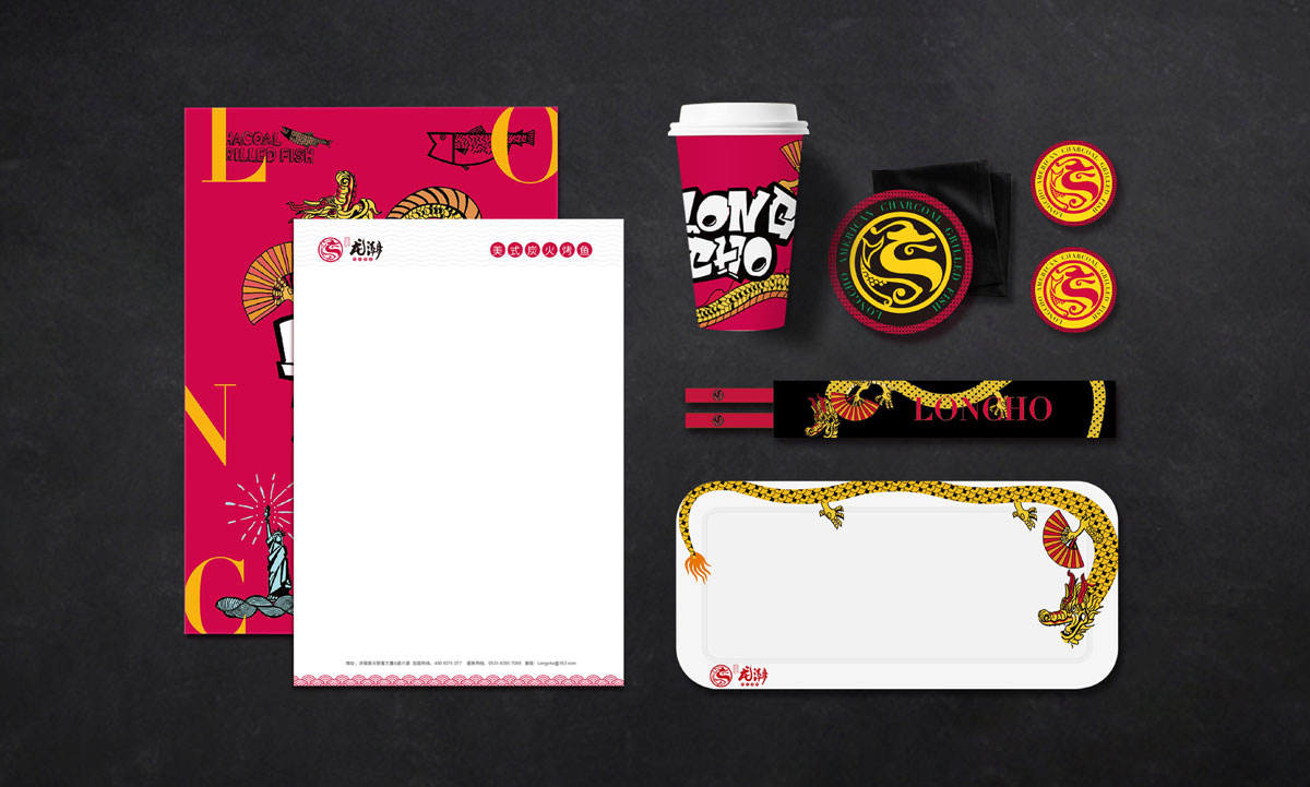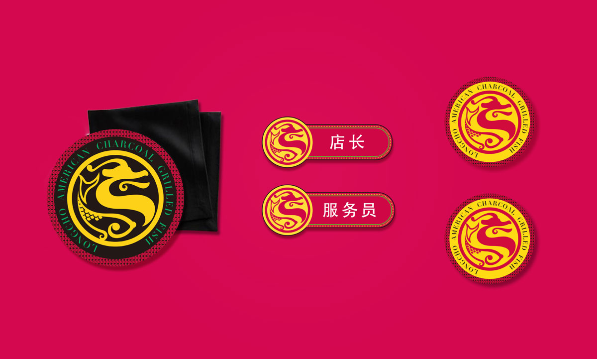 龙首鱼尾玉生辉,logo设计将龙、鱼和玉的形态作为灵感来源,进行了精准巧妙的融合。将龙尾融入传统书法,使“龙潮”生动形象又具有东方神韵。在企业品牌形象建设、VI系统、网站建设及店面SI系统的设计上,将美式和东方元素进行了大量的提炼和融合,使龙潮产品的美式风格与民族特质巧妙地结合在一起,使传统和现代感在碰撞中实现统一,打造出极具唐人街文化特色的主题餐厅,为龙潮完成了全国范围内统一的整体品牌形象创意设计。