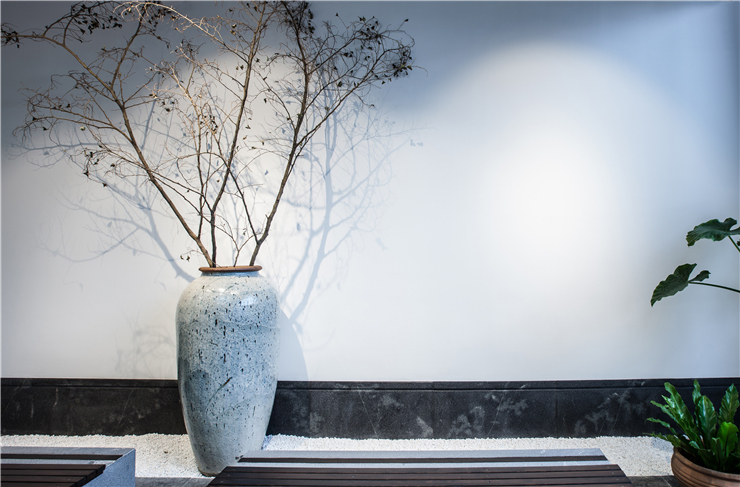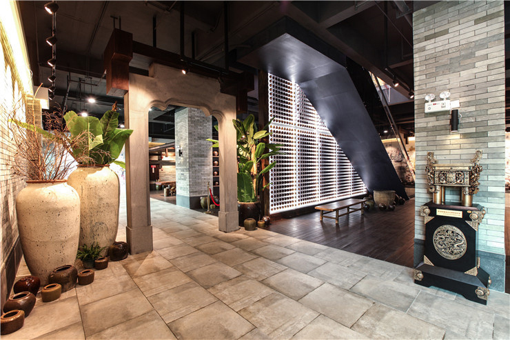 一楼上电梯处实景图,采用骑楼作为空间隔断,缀以景观小品,达到室内空间室外化的效果。