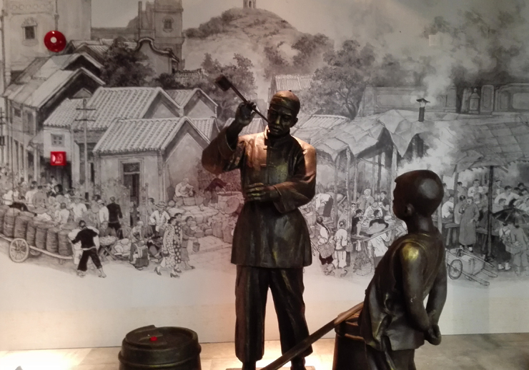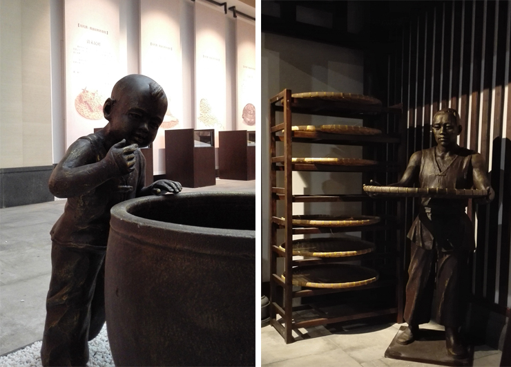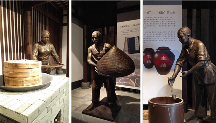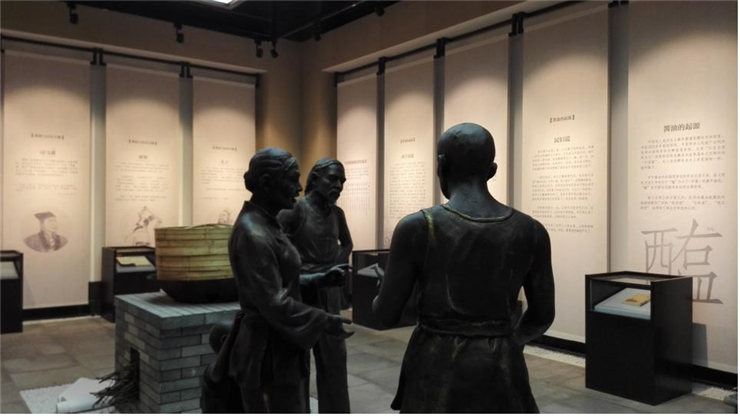 三楼历史展区实景图,以雕塑、灯光和壁画烘托场景,展现酱油的历史起源。