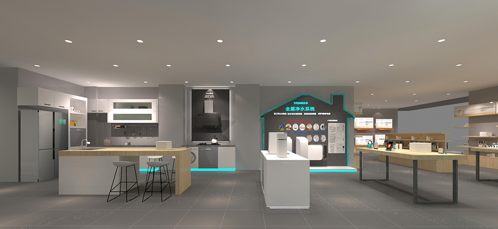 项目分为两个分区,一个部分为小米智能产品,另外一部分为云米的净水体验区,体验区则是通过厨房样板区的搭建来实地感受净水,而小米职能产品区则通过简约的展示台和背柜来展示。