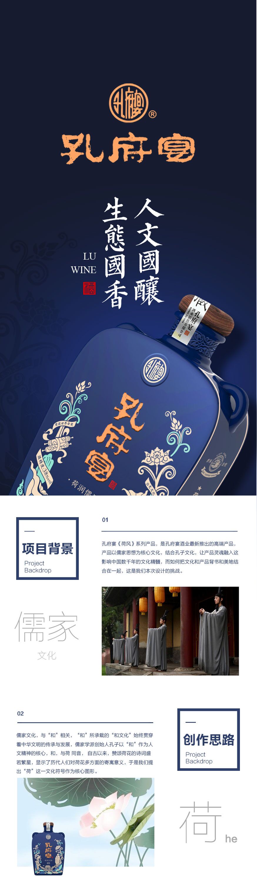 孔府宴《荷风》系列产品,是孔府宴酒业新推出的高端产品,产品以儒家思想为核心文化,结合孔子文化,让产品灵魂融入这影响中国数千年的文化精髓,而如何把文化和产品背书和美地结合在一起,这是我们本次设计的挑战。