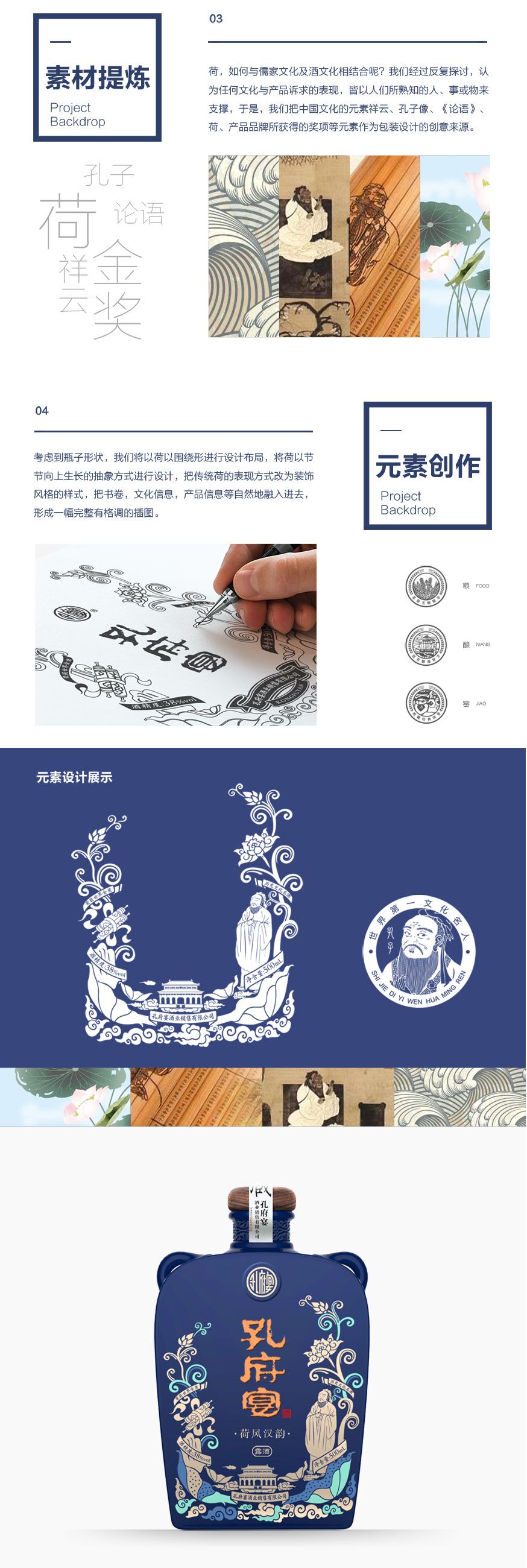荷,如何与儒家文化及酒文化相结合呢?我们经过反复探讨,认为任何文化与产品诉求的表现,皆以人们所熟知的人、事或物来支撑,于是,我们把中国文化的元素祥云、孔子像、《论语》、荷、产品品牌所获得的奖项等元素作为包装设计的创意来源。