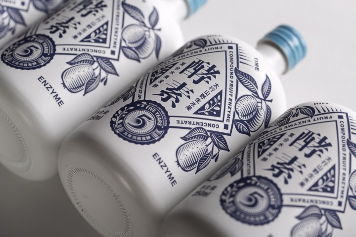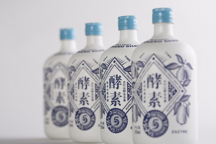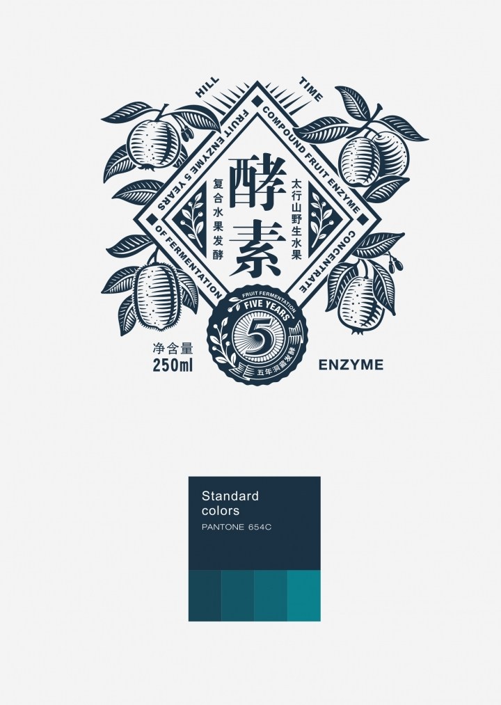 设计风格融入青花元素及有较强现代感的几何图形,意为传统工艺与时尚健康的现代生活方式融合,颜色以典雅的象牙白及清新的藏蓝色为主,突出水果酵素的原料纯净,自然。