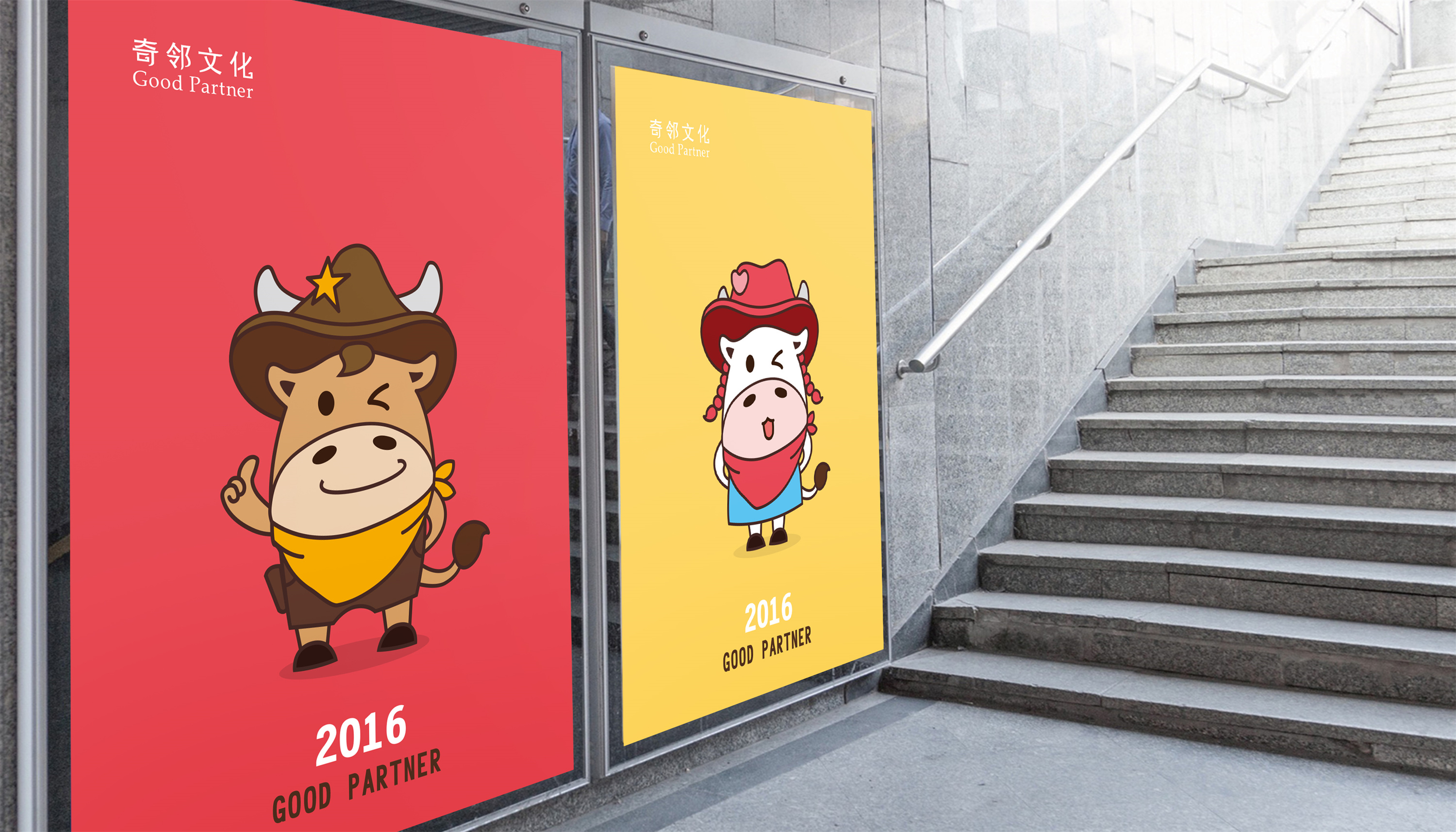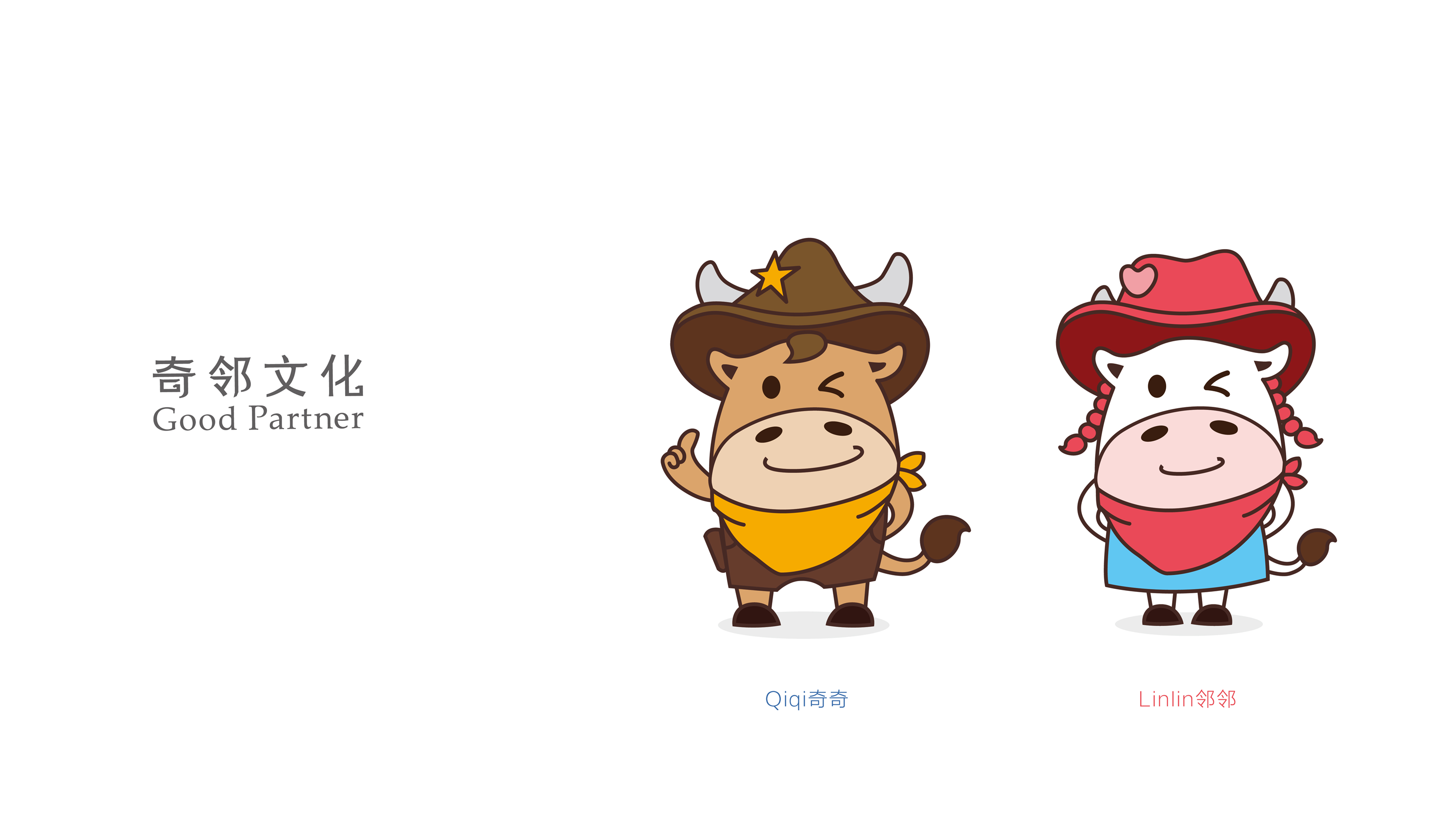 思路1、根据公司名称,我们将吉祥物设计为“男、女”两个可爱、顽皮的卡通牛形象,并分别命名为“奇奇”和“邻邻”,这种命名方式符合大众对卡通形象可爱、顽皮的理解;