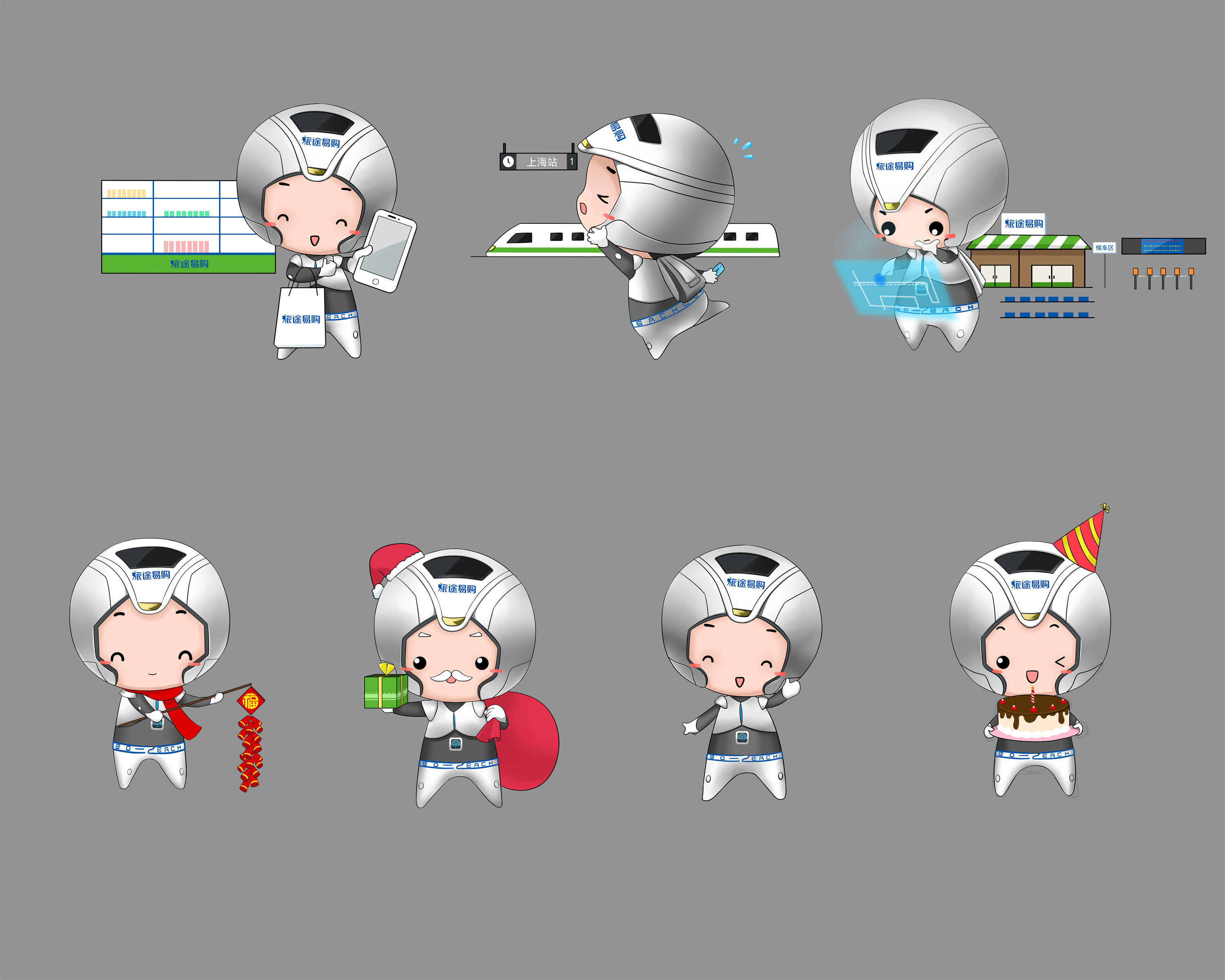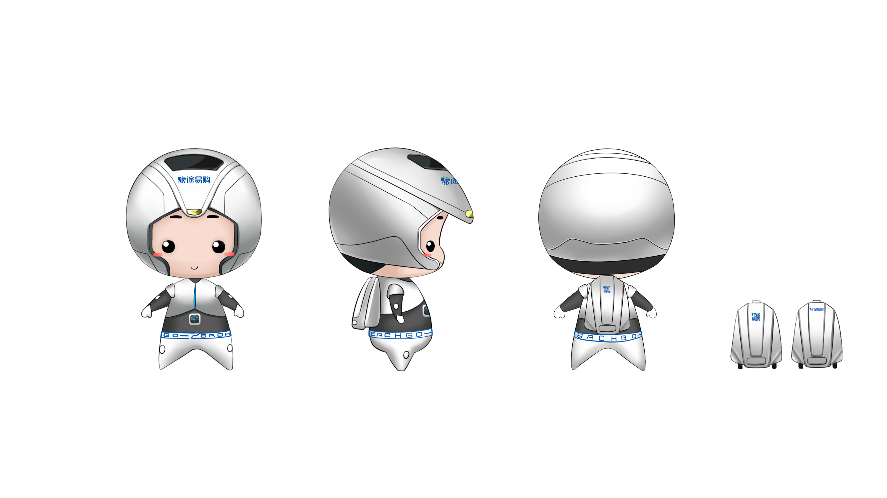 思路2、将配色设计成与高铁同样的颜色,加强了辨识度。同时在吉祥物的额头和后背处有LOGO显现,更加强了品牌识别度。将吉祥物的背包设计为旅行箱元素使吉祥物的形象更加立体;
