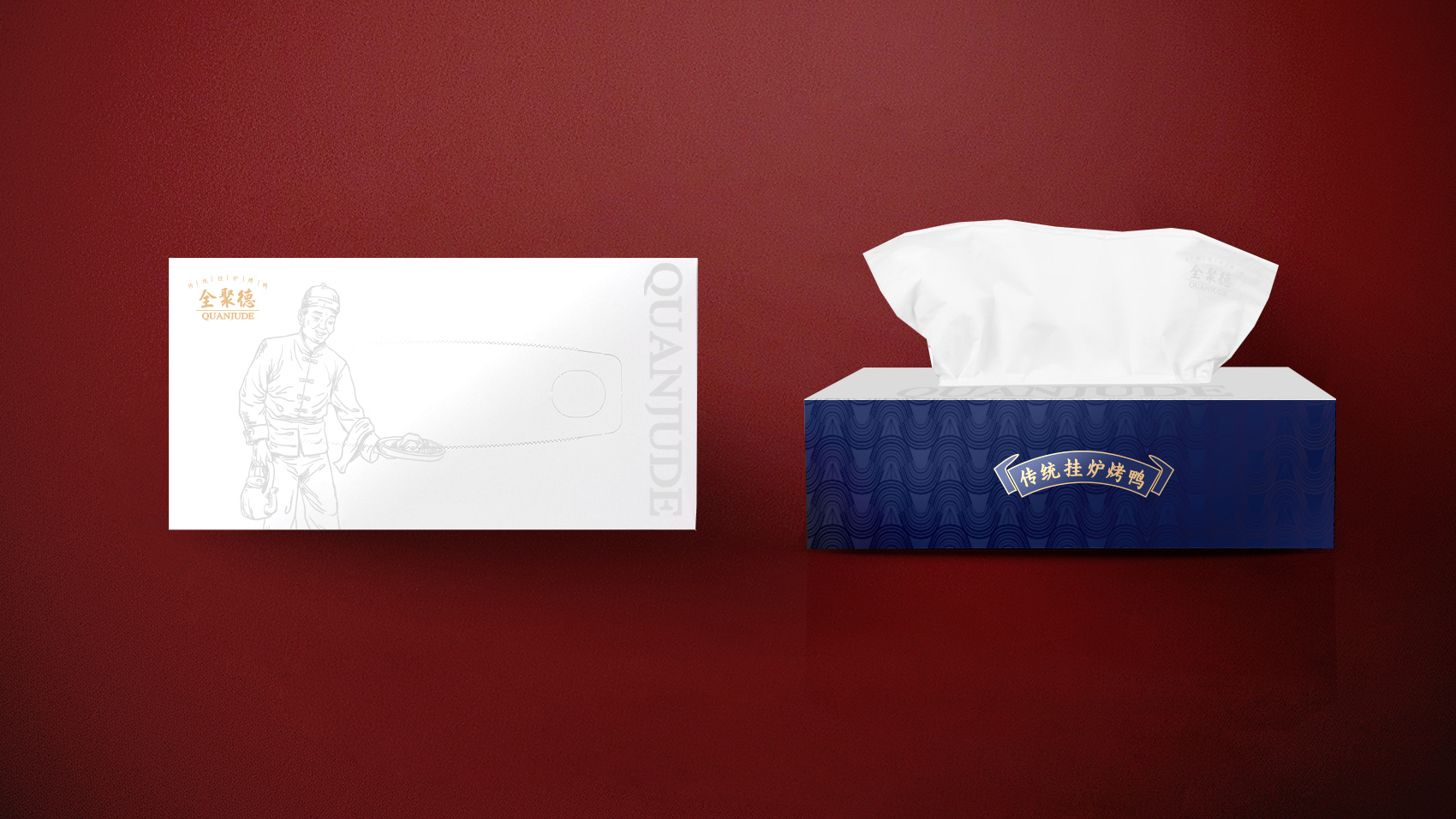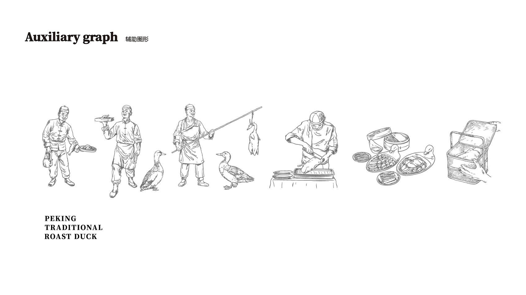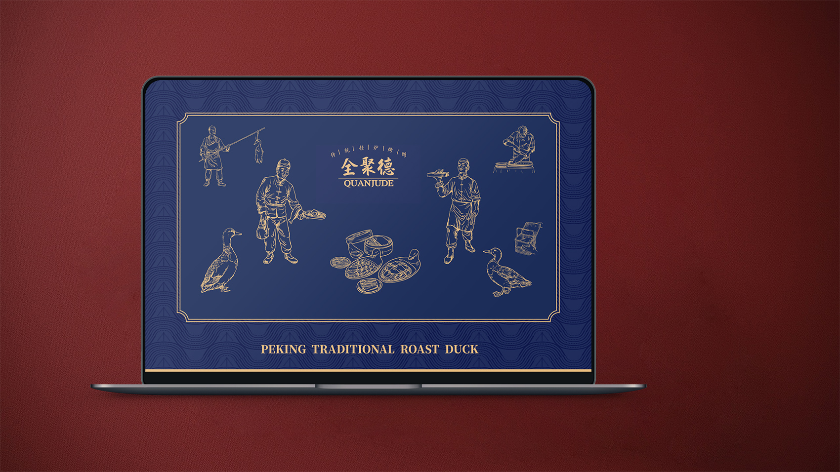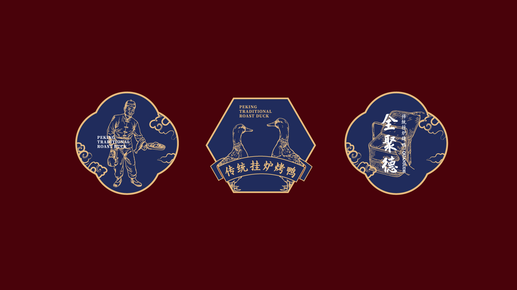品牌设计整体视觉采用中式复古风格,结合中国六边形、梅花形窗花、牌匾边框,再融合传统楷体与大宋字体,呈现全聚德国字老字号的高端品质与浑厚的文化底蕴。辅助图形通过插画线描的表现方式,展现全聚德烤鸭的制作手艺过程。