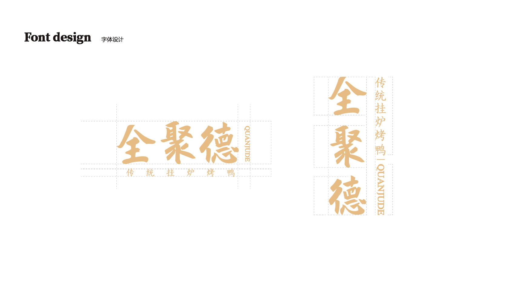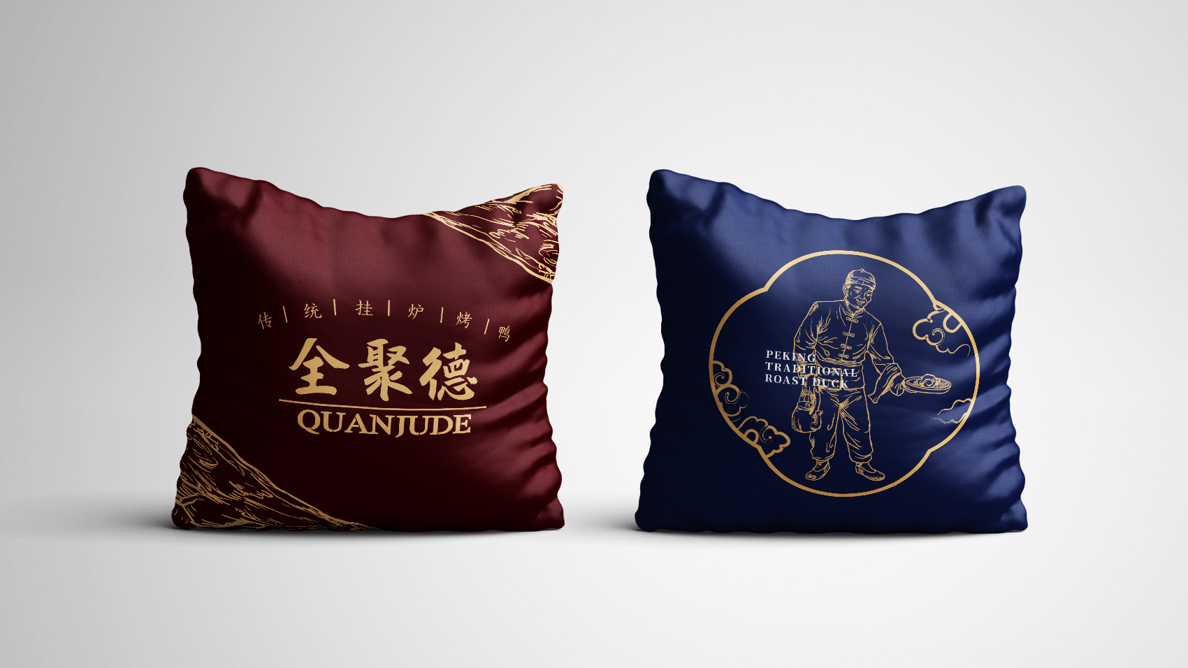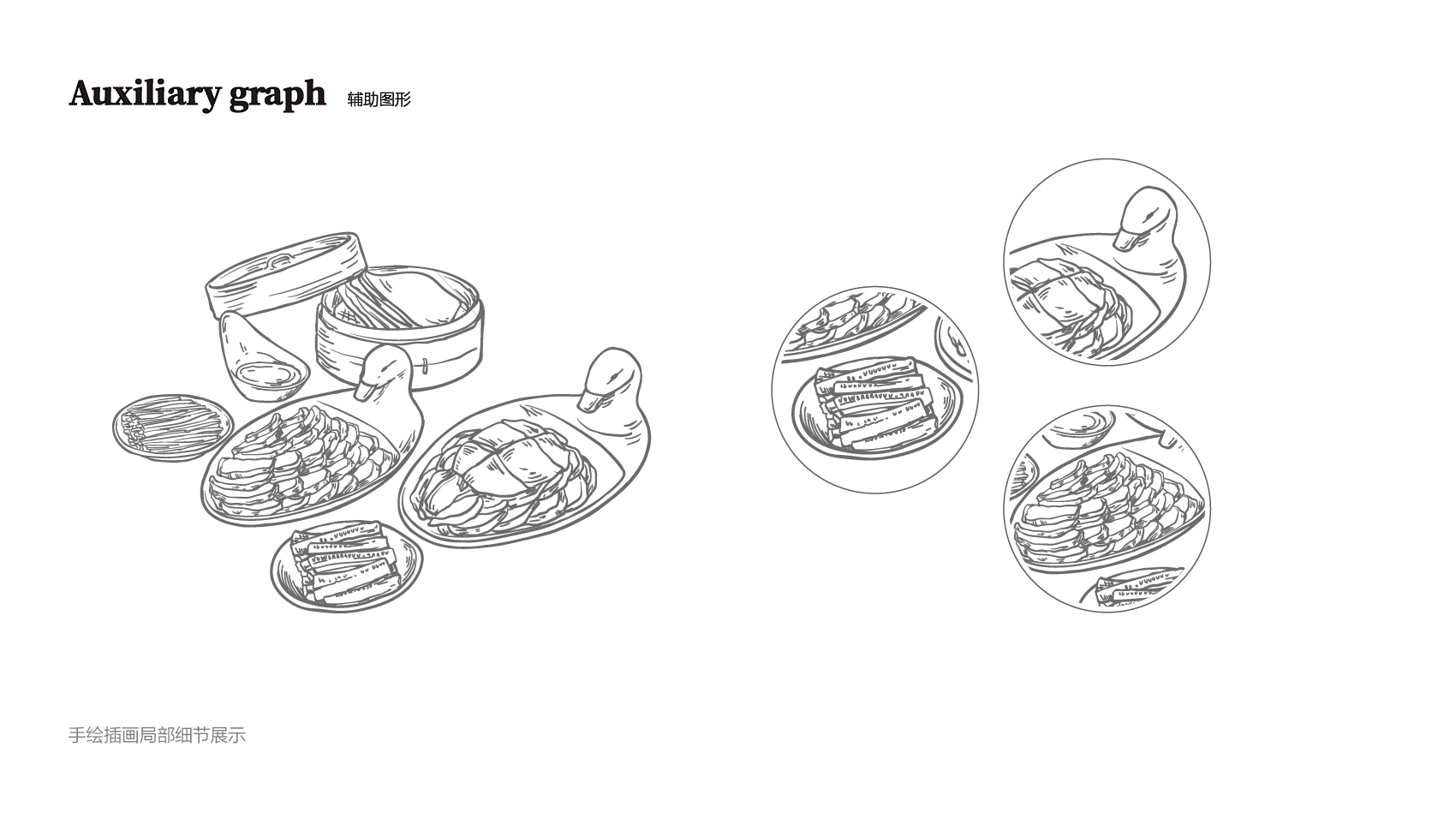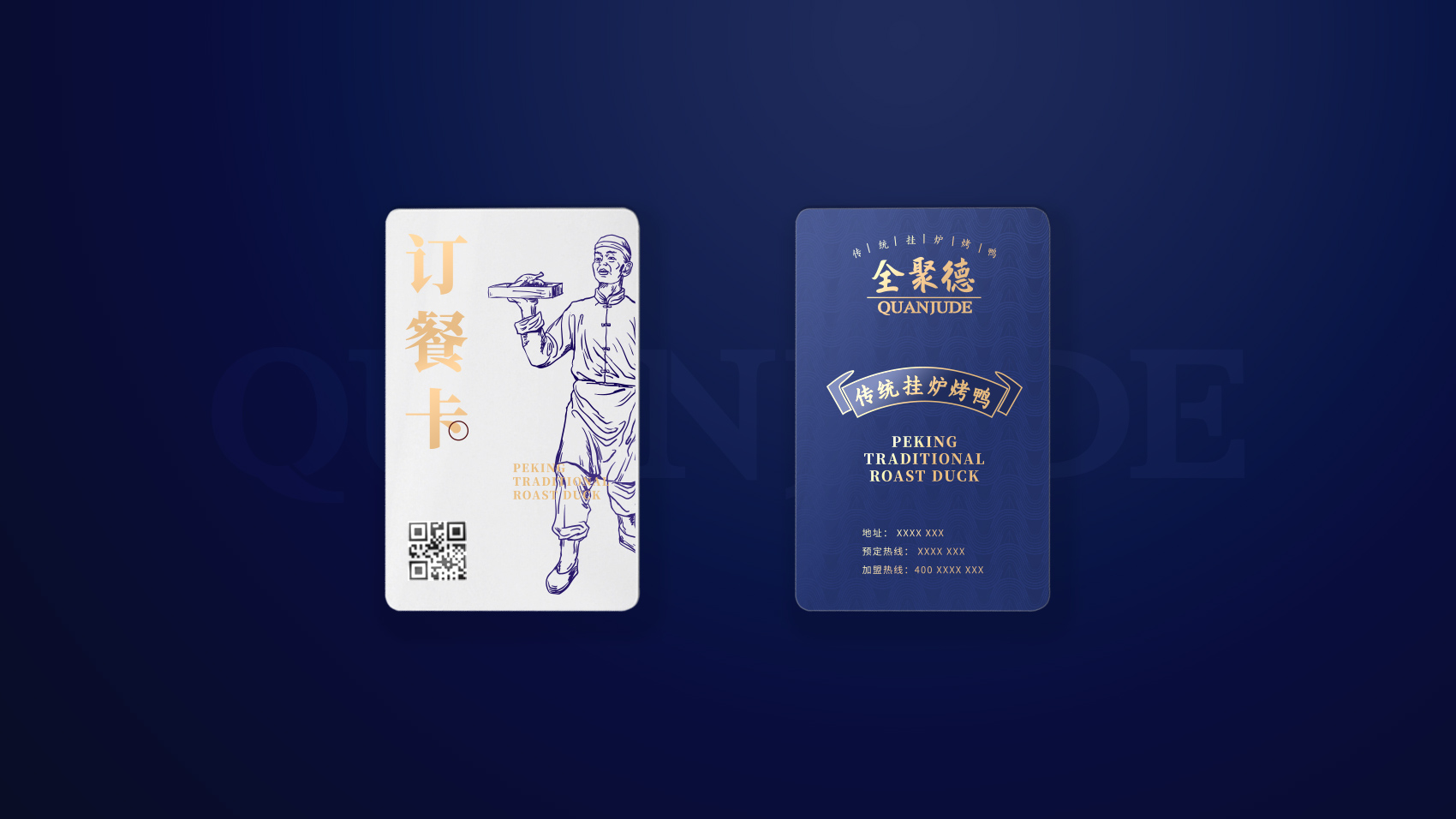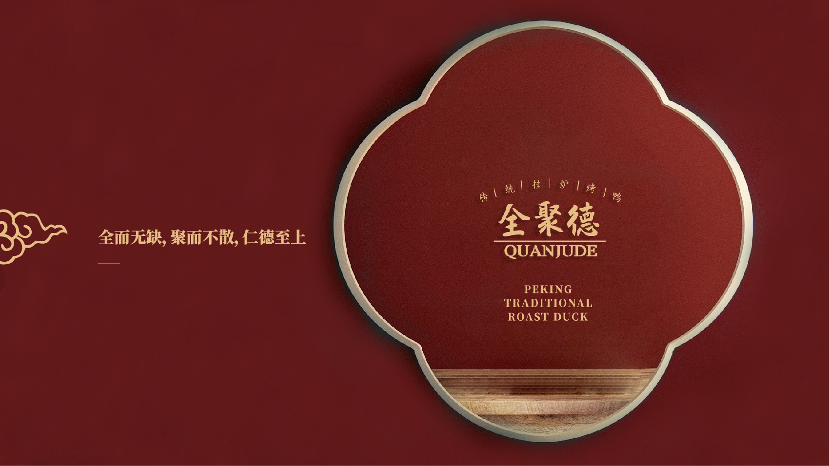 品牌设计整体视觉采用中式复古风格,结合中国六边形、梅花形窗花、牌匾边框,再融合传统楷体与大宋字体,呈现全聚德国字老字号的高端品质与浑厚的文化底蕴。辅助图形通过插画线描的表现方式,展现全聚德烤鸭的制作手艺过程。