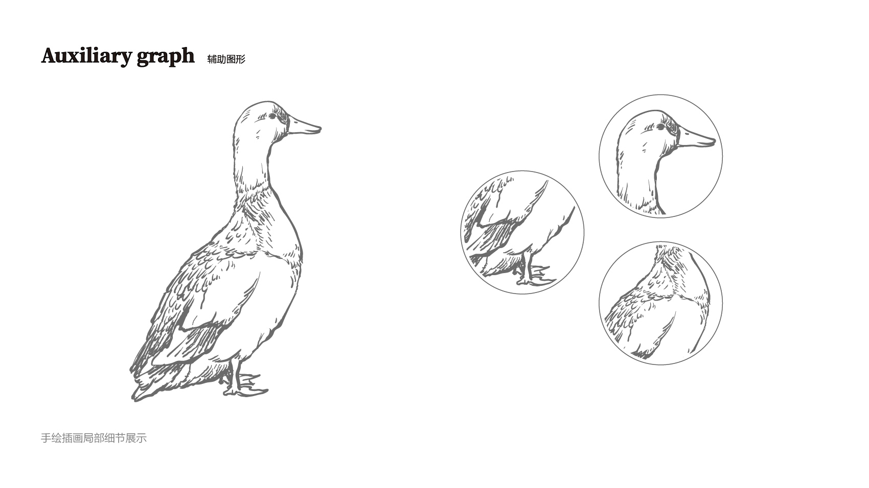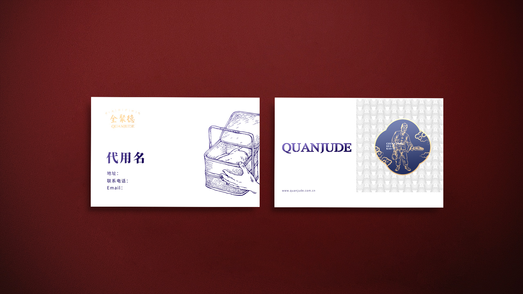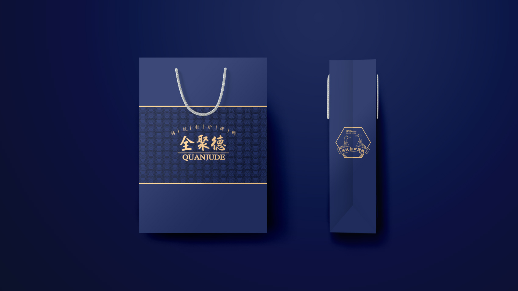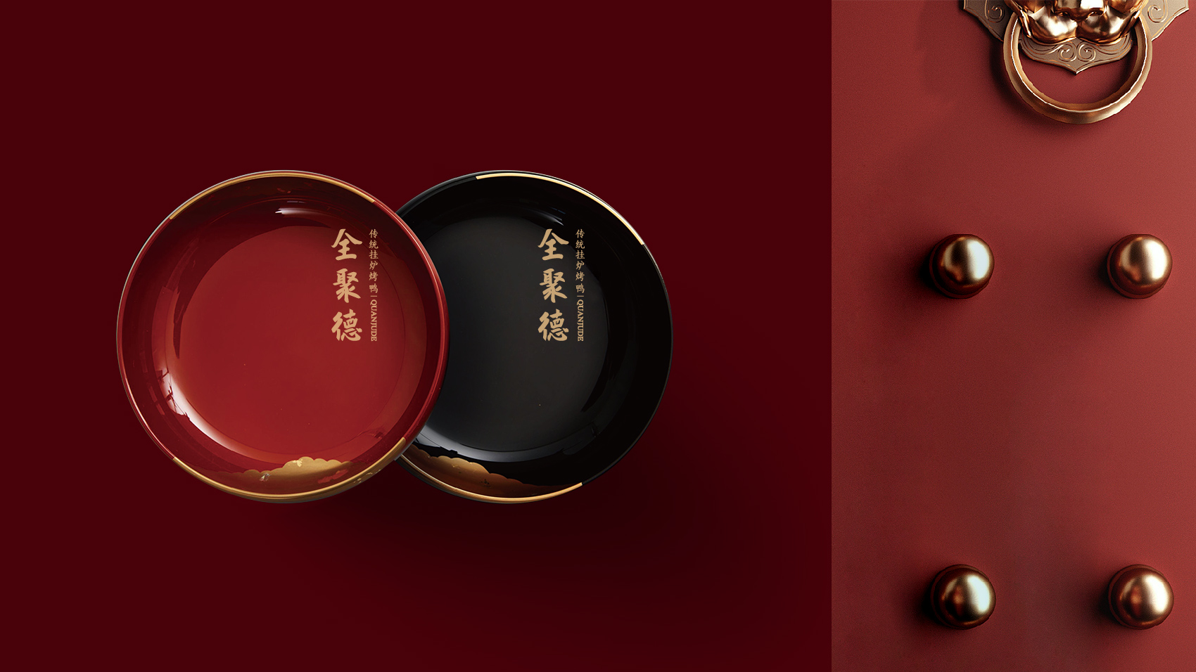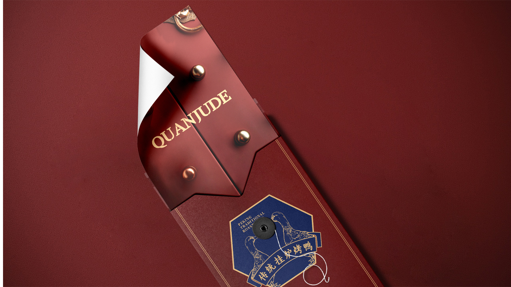 品牌设计整体视觉采用中式复古风格,结合中国六边形、梅花形窗花、牌匾边框,再融合传统楷体与大宋字体,呈现全聚德国字老字号的高端品质与浑厚的文化底蕴。辅助图形通过插画线描的表现方式,展现全聚德烤鸭的制作手艺过程。