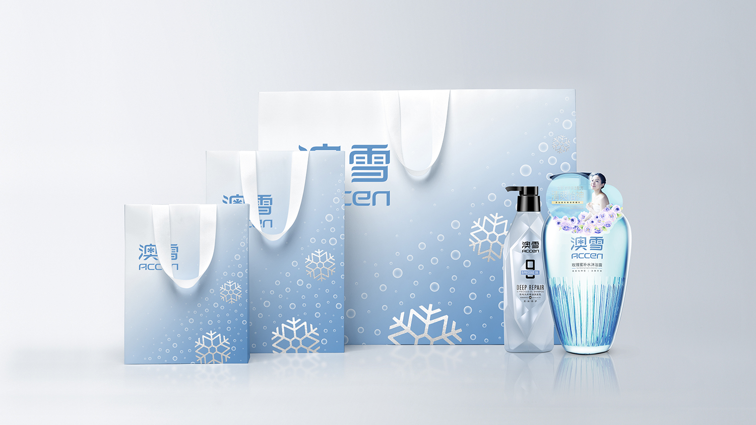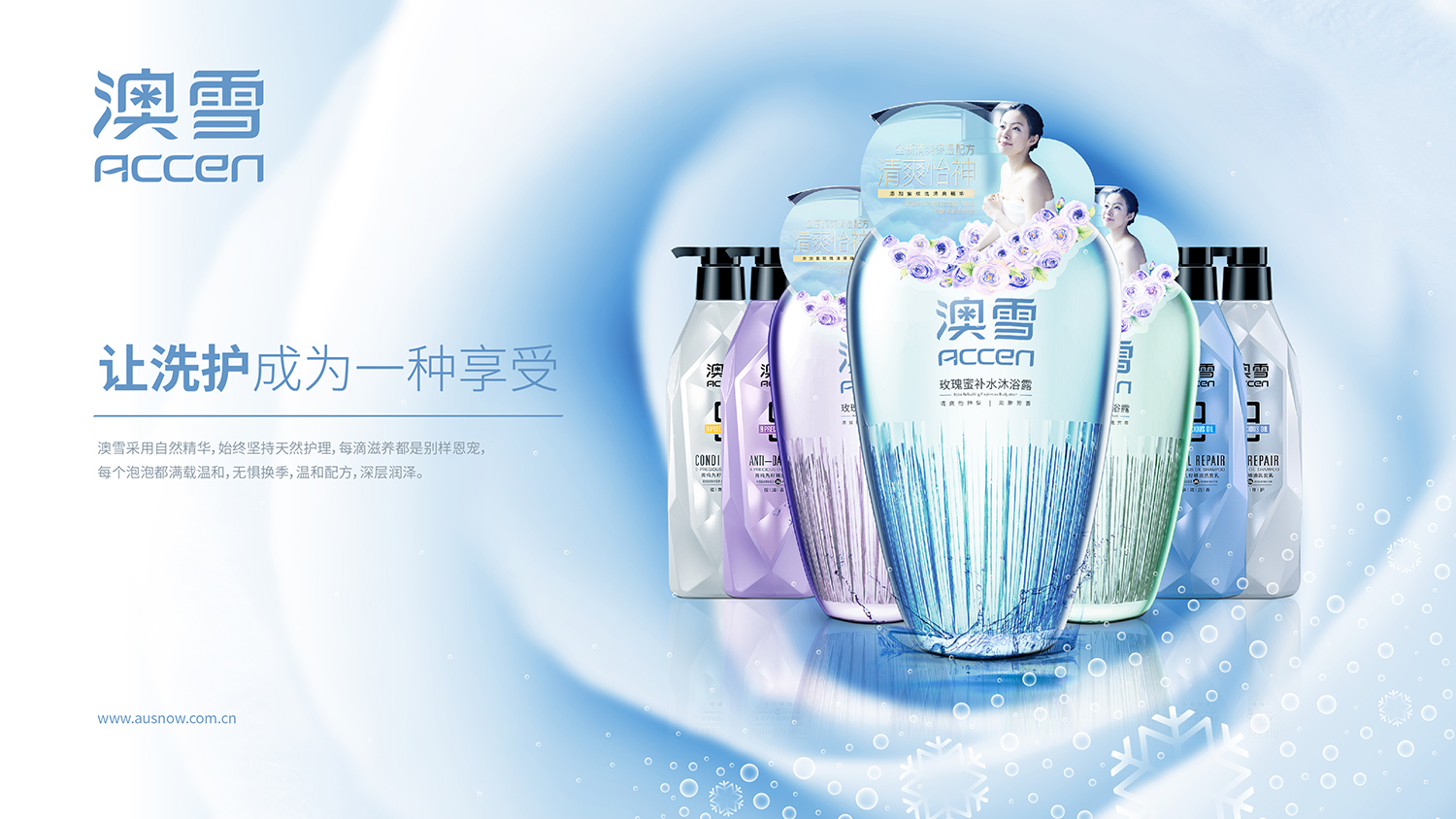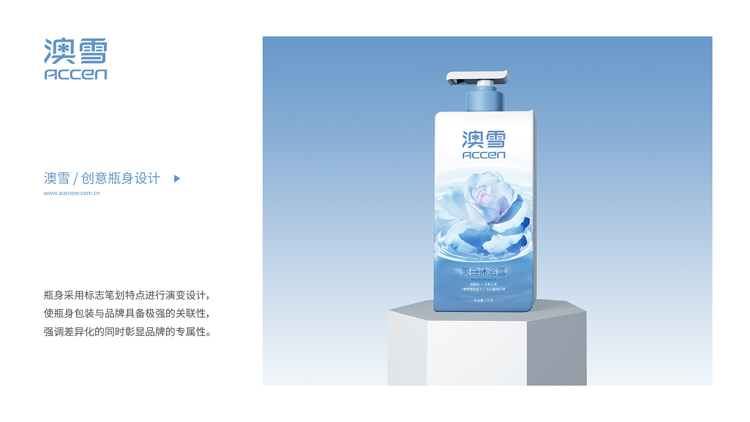 澳雪国际根植中华热土,始于1994年,以天然护理、个人健康为产品理念,全心全意为亿万中国百姓营造健康生活氛围、塑造美丽生活典范。瓶身采用标志笔划特点进行演变设计,是瓶身包装与品牌具备极强的关联性,强调差异化的同时彰显品牌的专属性。