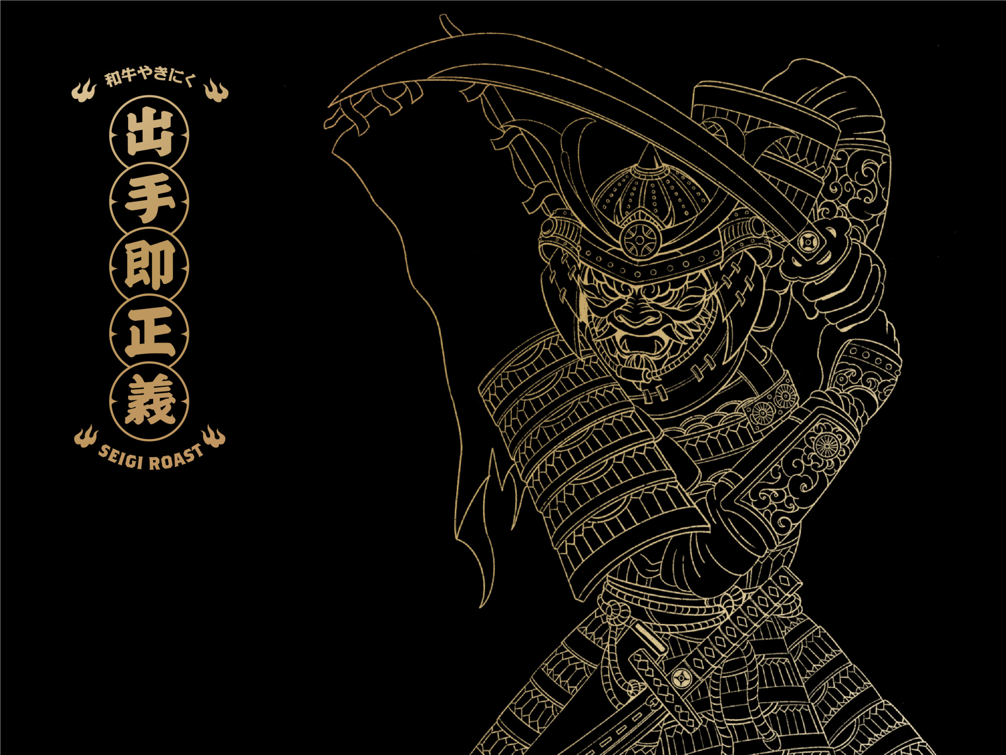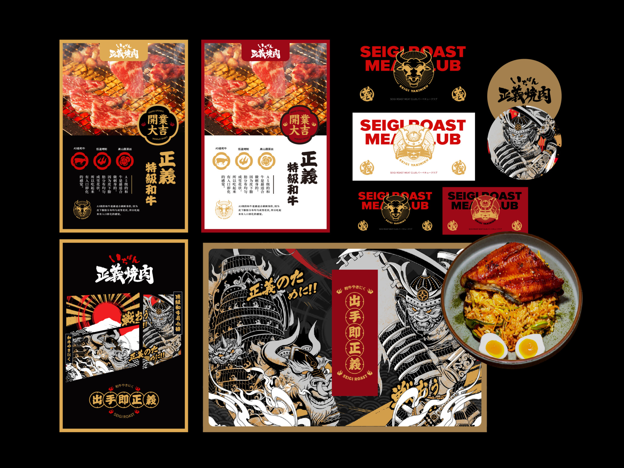 这是一家高端的日式烤肉店的形象VI设计。设计之前我们走访当地商圈的餐饮店,找到设计上的差异化定位,并为了体现店名的主题,搜集了很多日本代表正义的象征,想要通过用插画的形式来凸显一种严谨,正气凛然的气势,同时以年轻人喜欢的风格和画面来吸引消费。
