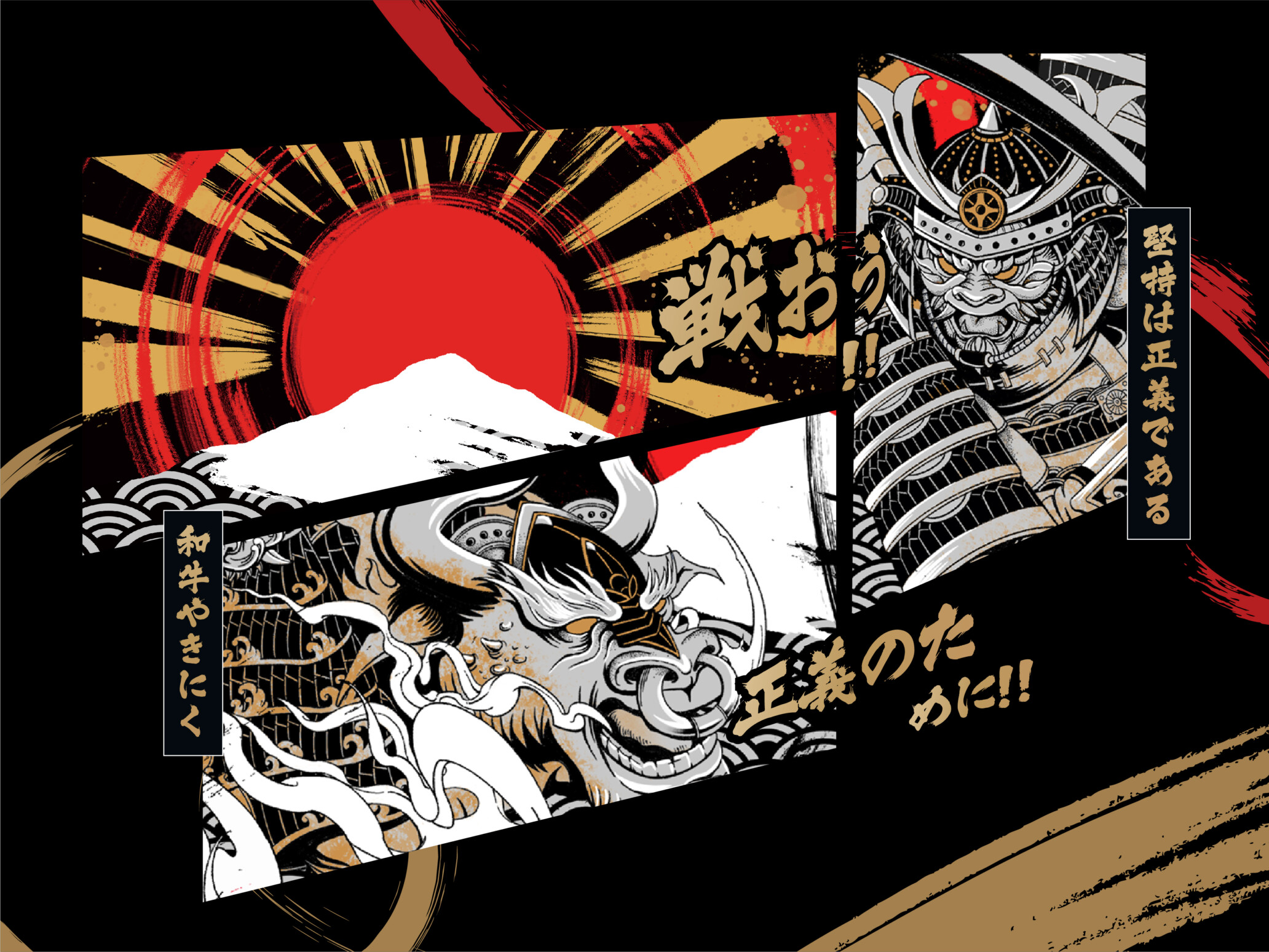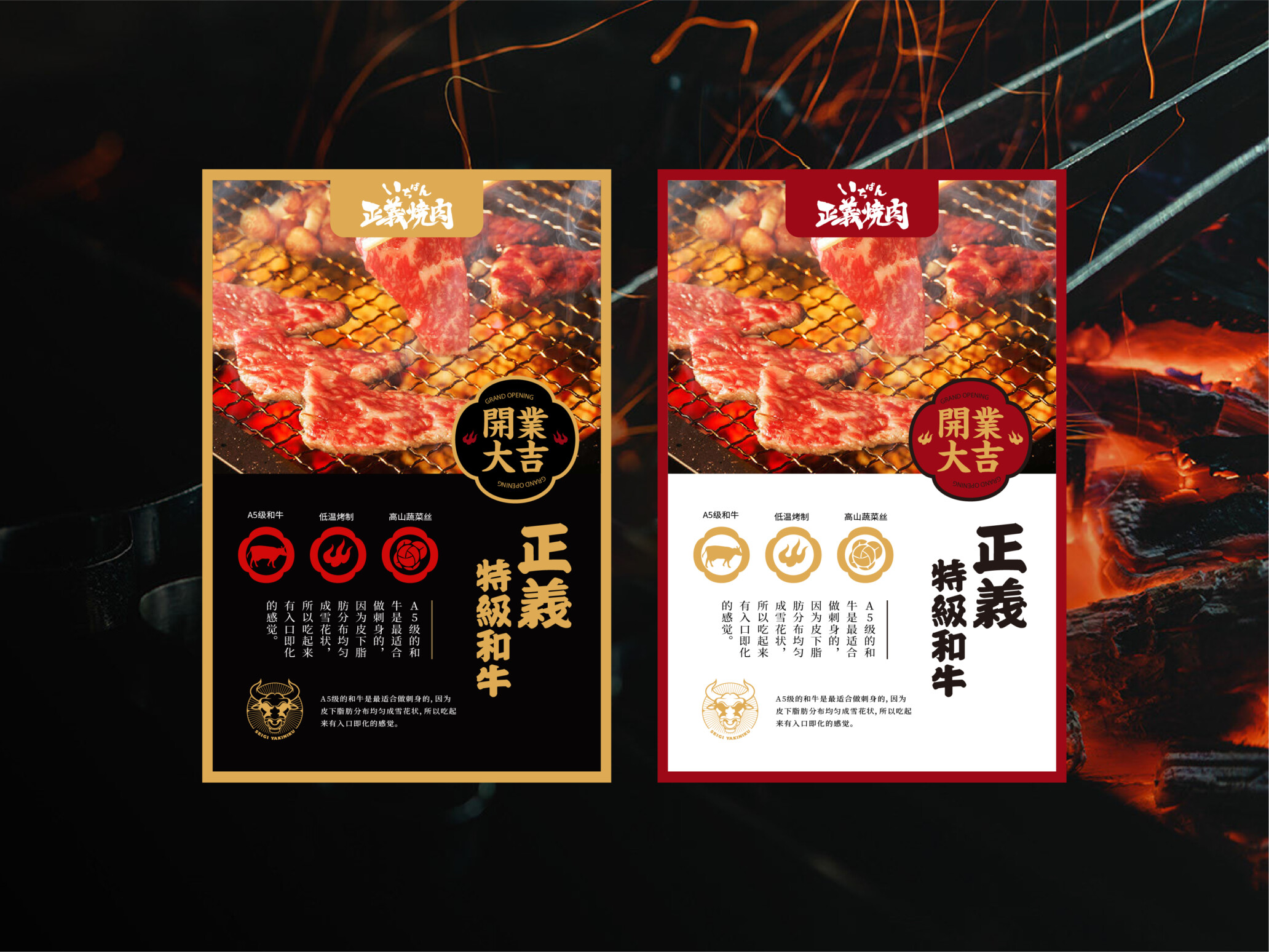 我们的设计灵感来自于日本正义的象征,武士。而原则公牛的原因,一方面是店内主食,而也是国外一种正义的代表。而选取正义作为核心主题,则是体现餐饮经营理念,用心在行业钻研追求极致完美,在日本文化中就是一种正义。在插画元素中,我们融合的文化元素还有著名景点,富士山,点缀不同的绘画元素,代表事业日出东山,蒸蒸日上。