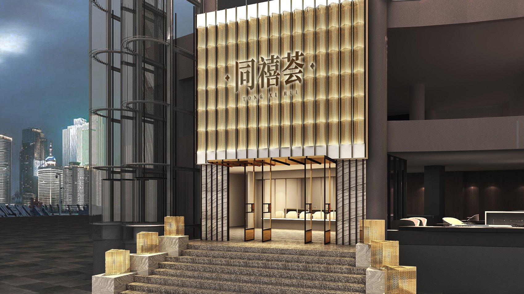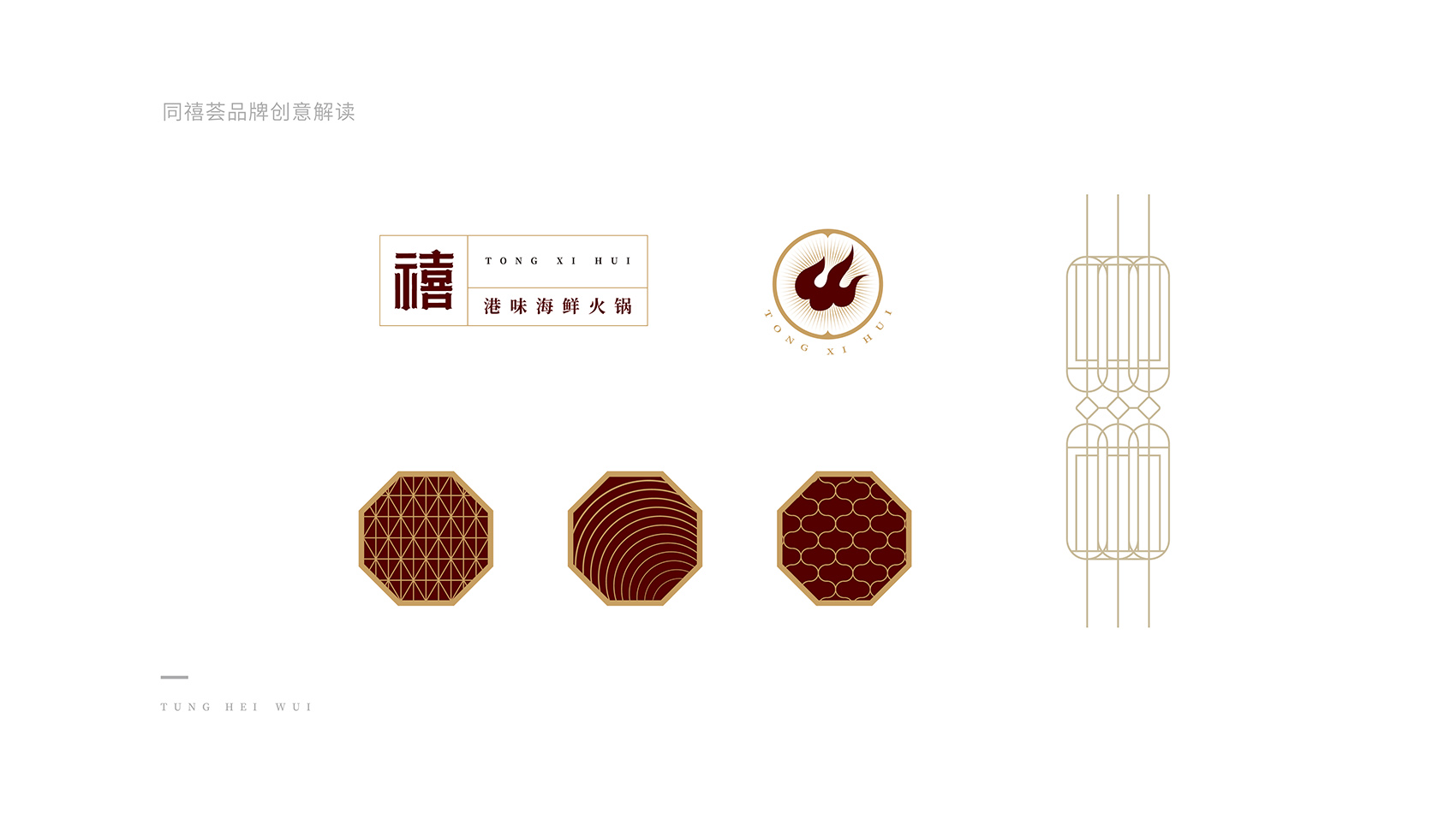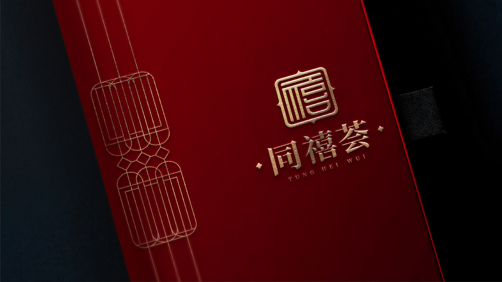 同禧荟标志符号以“禧”字融合中国的印章元素,展现了富有中国特色文化的品牌内涵及中式传统的美好寓意。以线条做碗、筷,以融合、交汇宴请宾客为设计理念,体现出餐饮品牌给人宾客如归的感受。VI视觉中提取传统花纹作为辅助图形,使用简练的设计语言,采用现代国际化表现方式,传达出了现代中式的高端感和文化感。大气尊贵的金色搭配高贵典雅的红色,突出就餐环境精致感的同时,还加深了品牌的高级感。