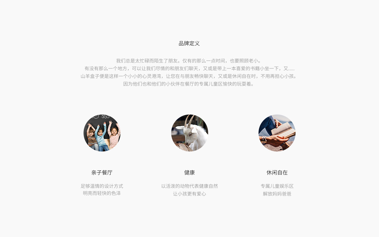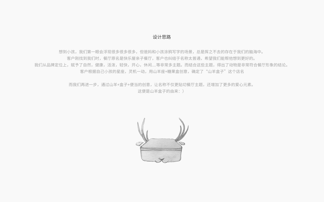 我们从品牌定位上,赋予了自然,健康,活泼,轻快,开心,休闲....等非常多主题。而结合这些主题,得出了动物是非常符合餐厅形象的结论客户根据自己小孩的星座,灵机一动,用山羊座+糖果盒创意,确定了“山羊盒子”这个店名。而我们再进一步,通过山羊+盒子+便当的创意,让名称不仅更贴切餐厅主题,还增加了更多的爱心元素。这便是山羊盒子的由来。